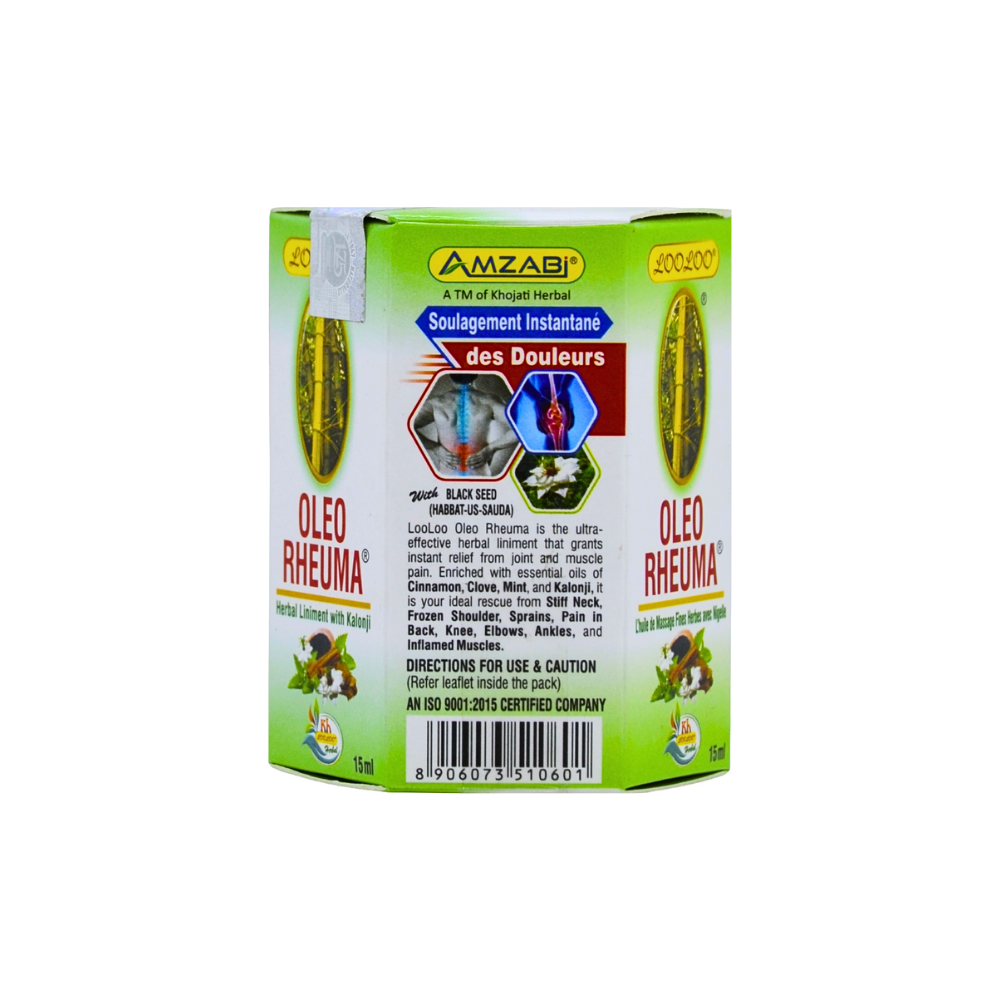 OLEO RHEUMA Oil, Herbal Liniment with Kalonji 15ml, is a natural pain-relieving oil formulated with the power of black seed (kalonji) and other potent herbal extracts. This soothing liniment helps relieve joint and muscle pain, stiffness, and inflammation caused by fatigue or strain. Its deep-penetrating formula improves blood circulation and provides a gentle warming effect for quick relief and relaxation. Ideal for backache, shoulder pain, arthritis, and general body discomfort, OLEO RHEUMA Oil offers fast, effective, and natural comfort without any harmful chemicals — making it a trusted choice for everyday body care and pain relief.